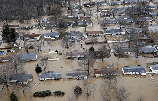 In this aerial photo taken on 12/31/15, homes in Arnold, MO, are surrounded by floodwaters. Photo credit: Jeff Roberson